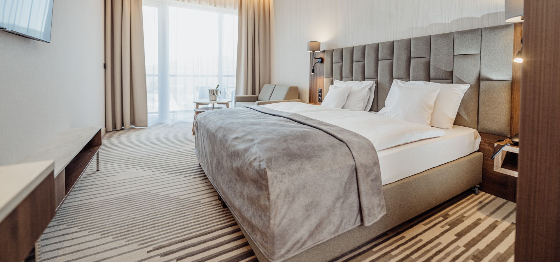 Pokoje w hotelu są przestronne i elegancko urządzone, a duże okna zapewniają dostęp do naturalnego światła i widok na górskie krajobrazy. Do dyspozycji gości pozostaje również strefa wellness, gdzie można skorzystać z basenu, sauny oraz szerokiej gamy zabiegów relaksacyjnych. Hotel oferuje także nowoczesne centrum fitness, które umożliwia aktywny wypoczynek nawet w czasie niepogody.